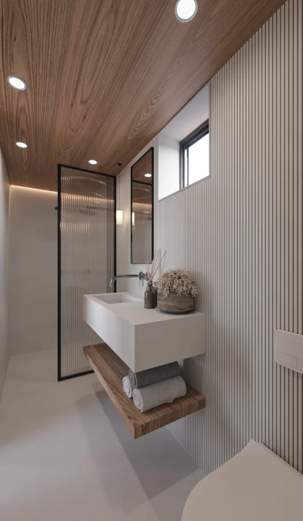 - Badkamer met Beton Cire afwerking, geborsteld RVS sanitair en Quooker kraan