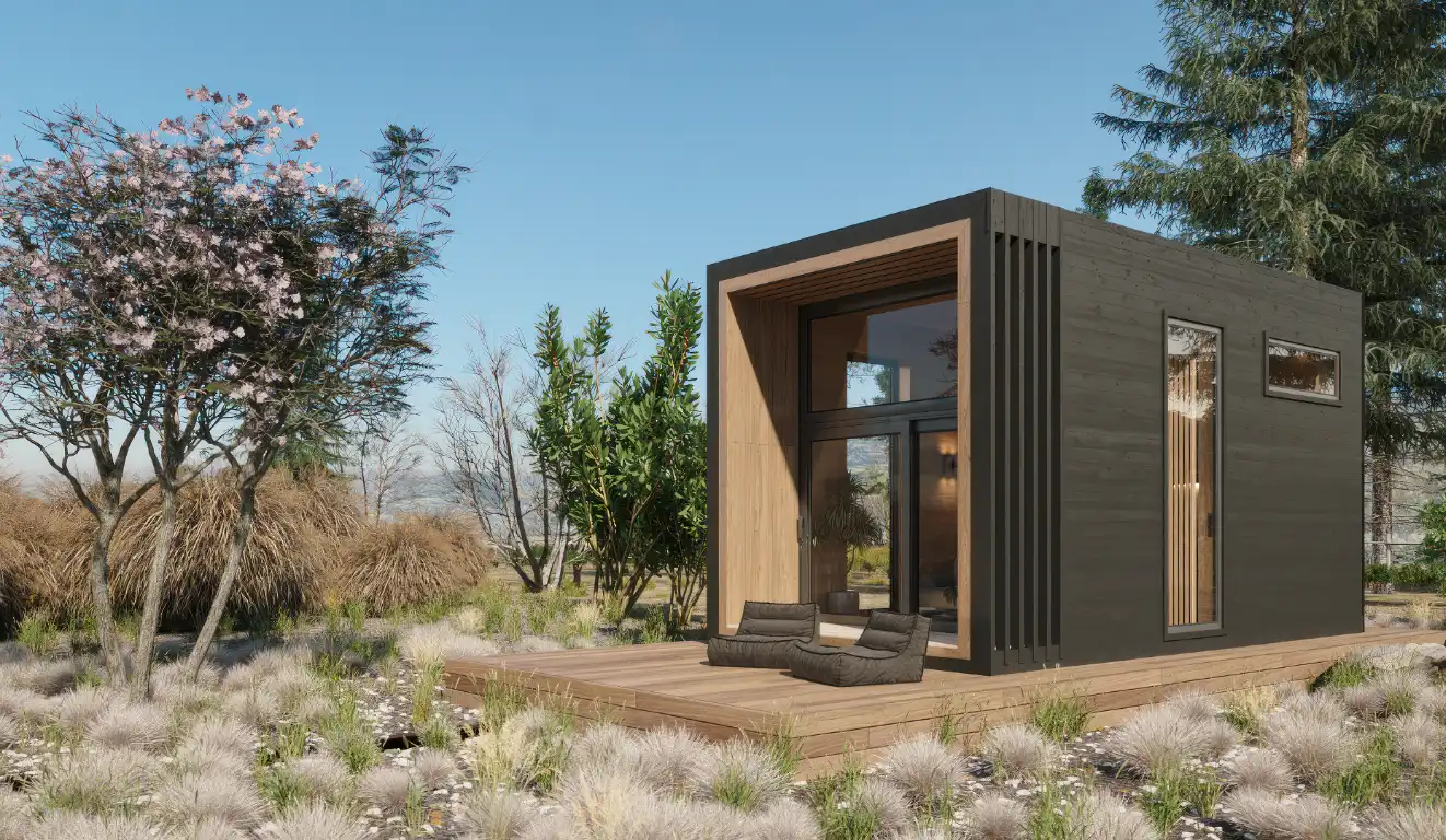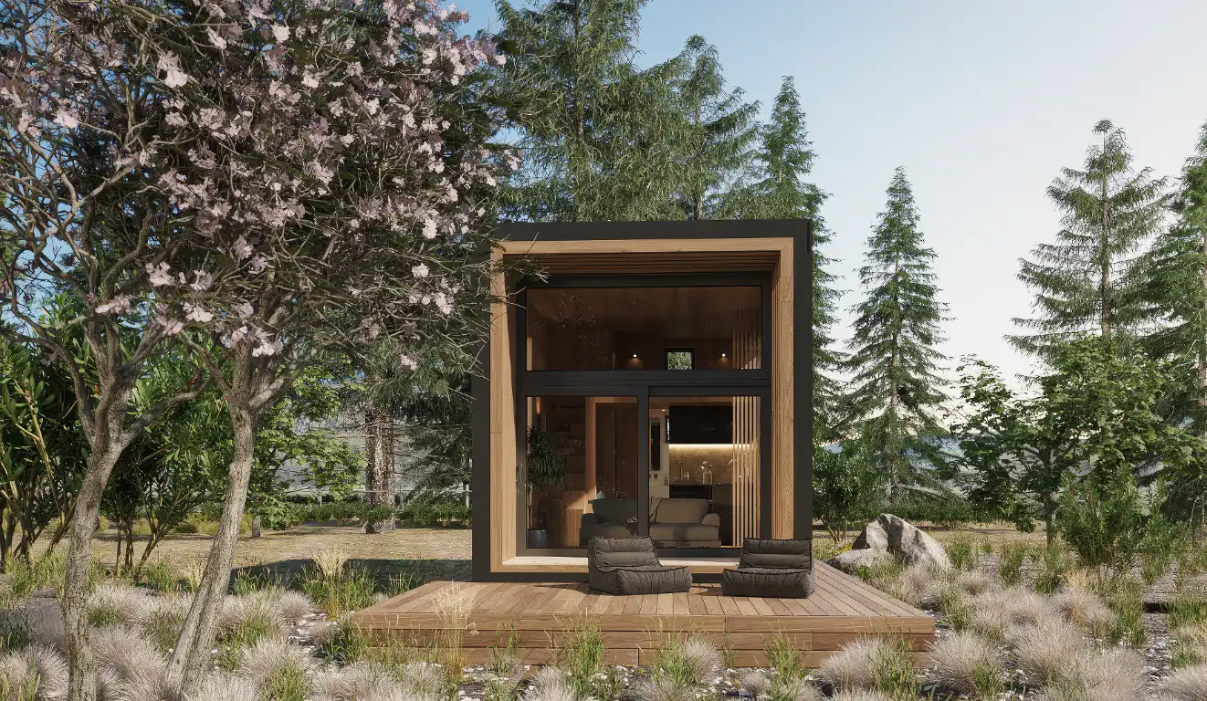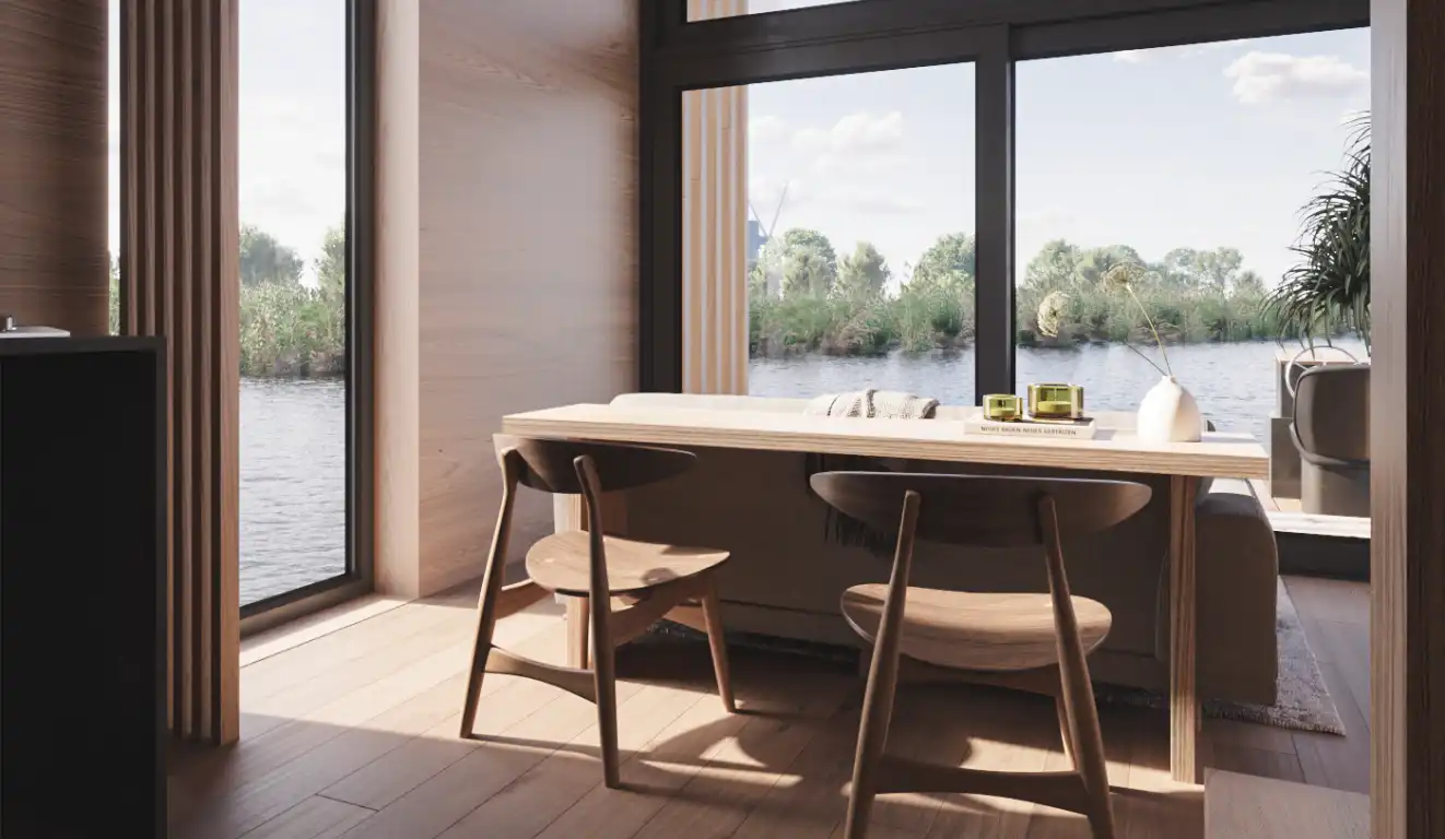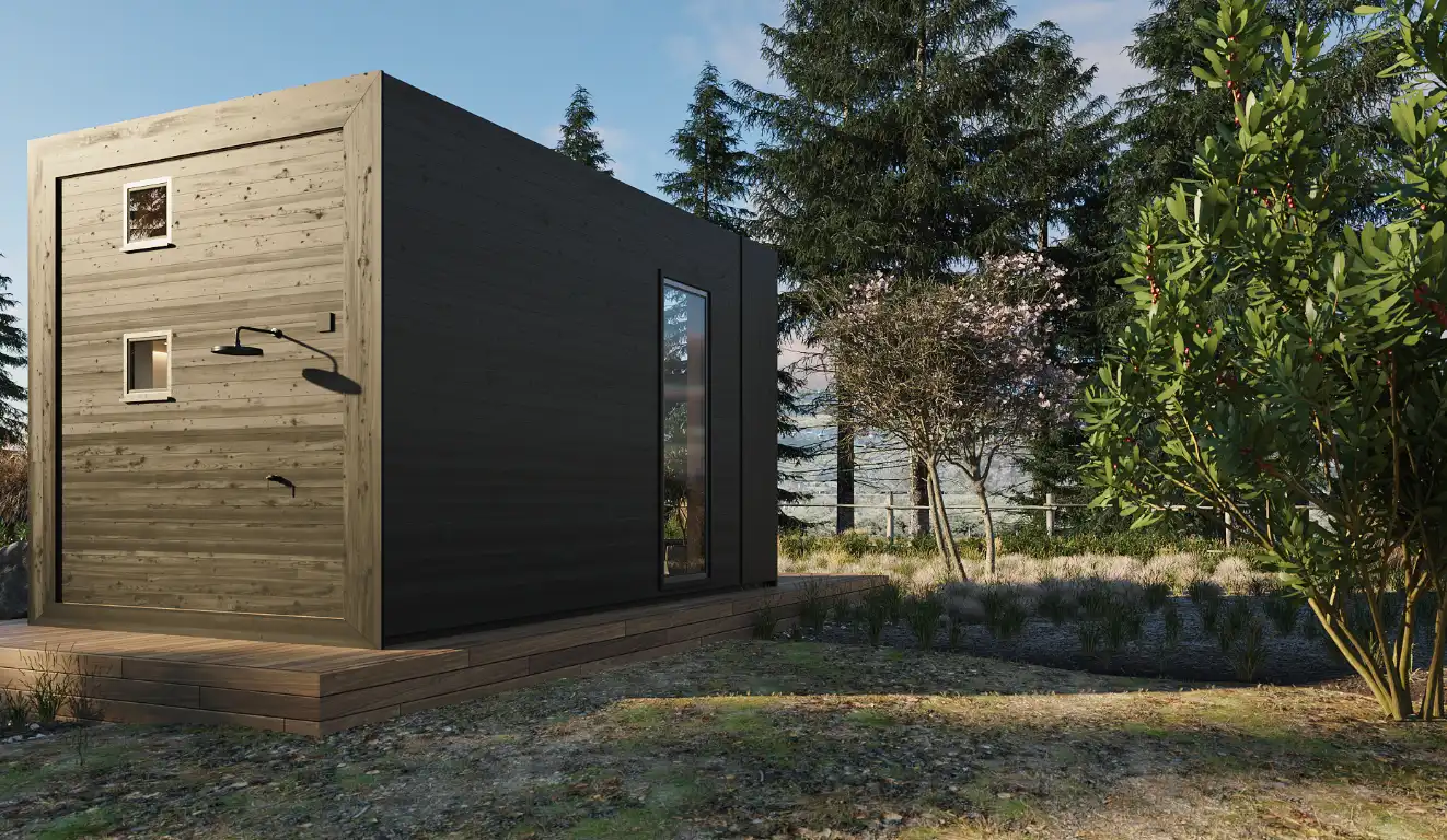 - Exterieur: Thermisch gemodificeerde gevelbekleding in eiken of zwart sparrenhout
