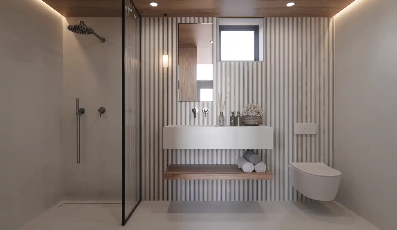 - Badkamer met Beton Cire afwerking, geborsteld RVS sanitair en Quooker kraan
