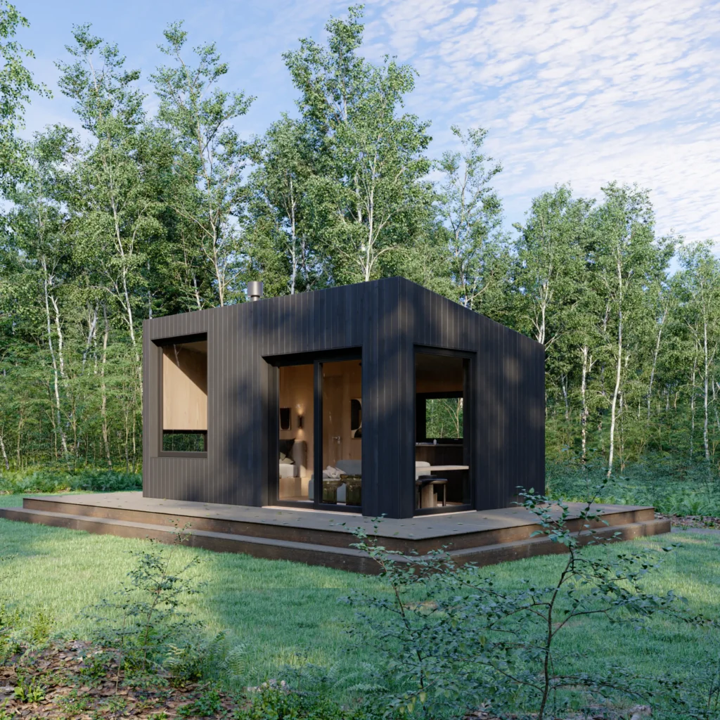 De YW05 cabin benut zijn 21 m² optimaal door bed, woonkamer en keuken naadloos te integreren. Panoramische ramen en verfijnde details zorgen voor een premium gevoel in een compact formaat.